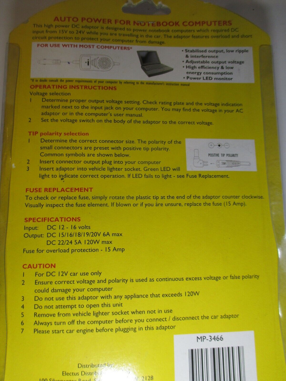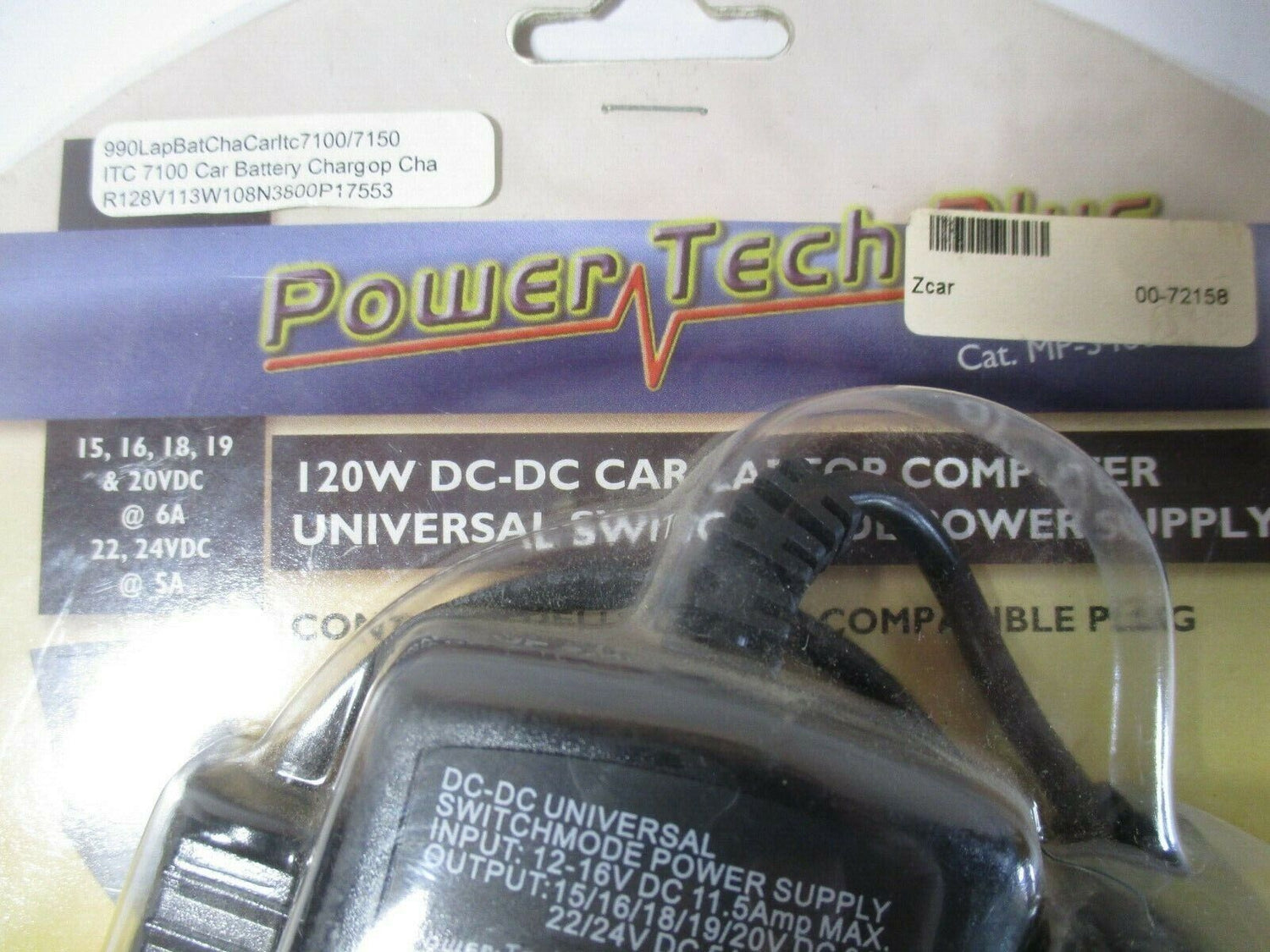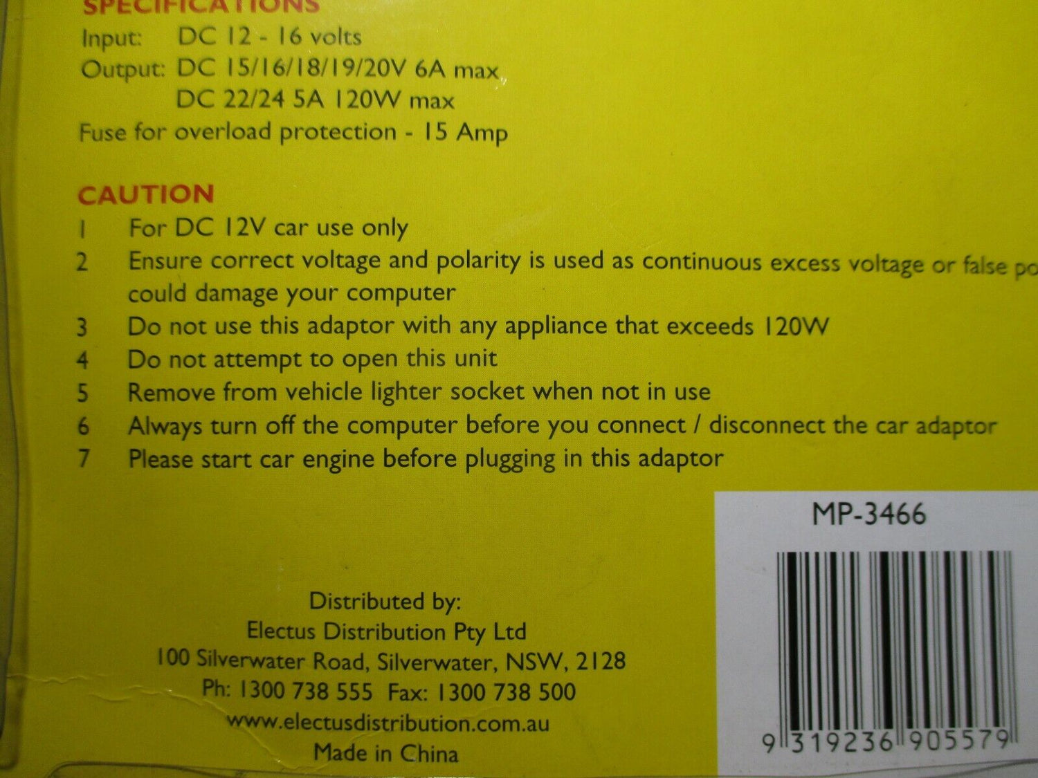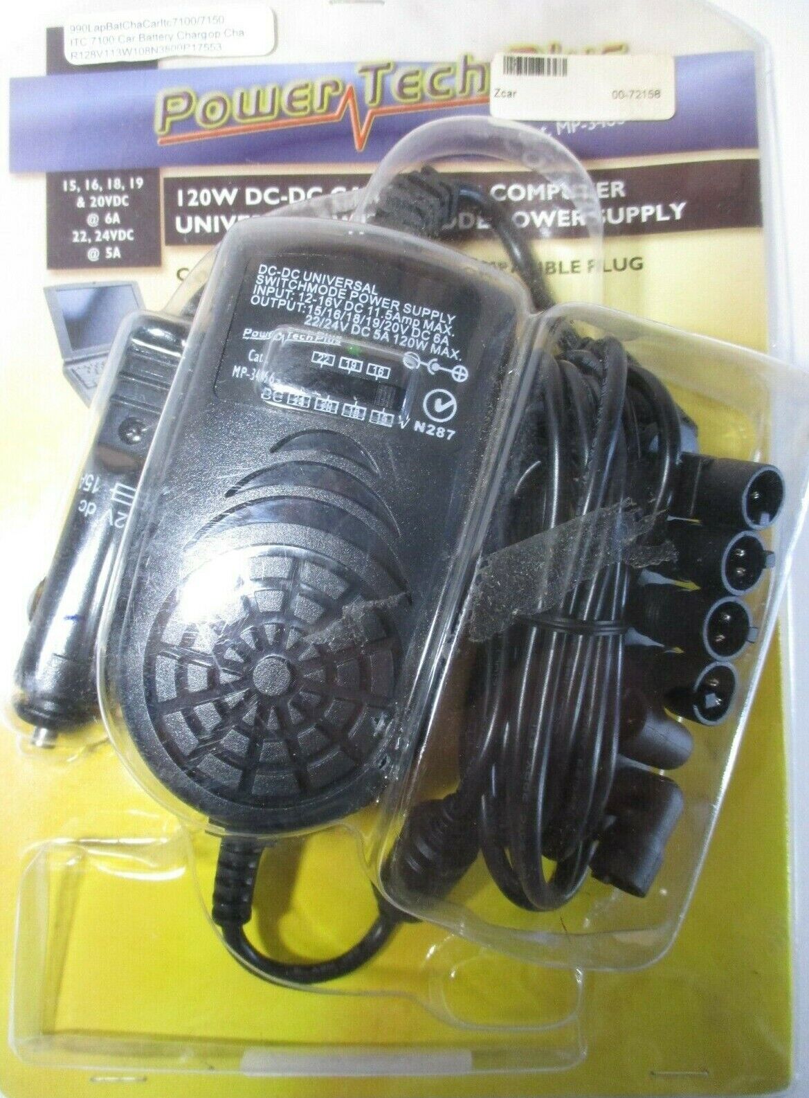 Car and Air Notebook Charger: 120W Input 12V-16V Max Output 15/16/18/19/20/V 6A Max DC 22/24 5A 120W Max. PowerTech Plus MP-3466  Multiple tips (x6) (which will not suit all devices)